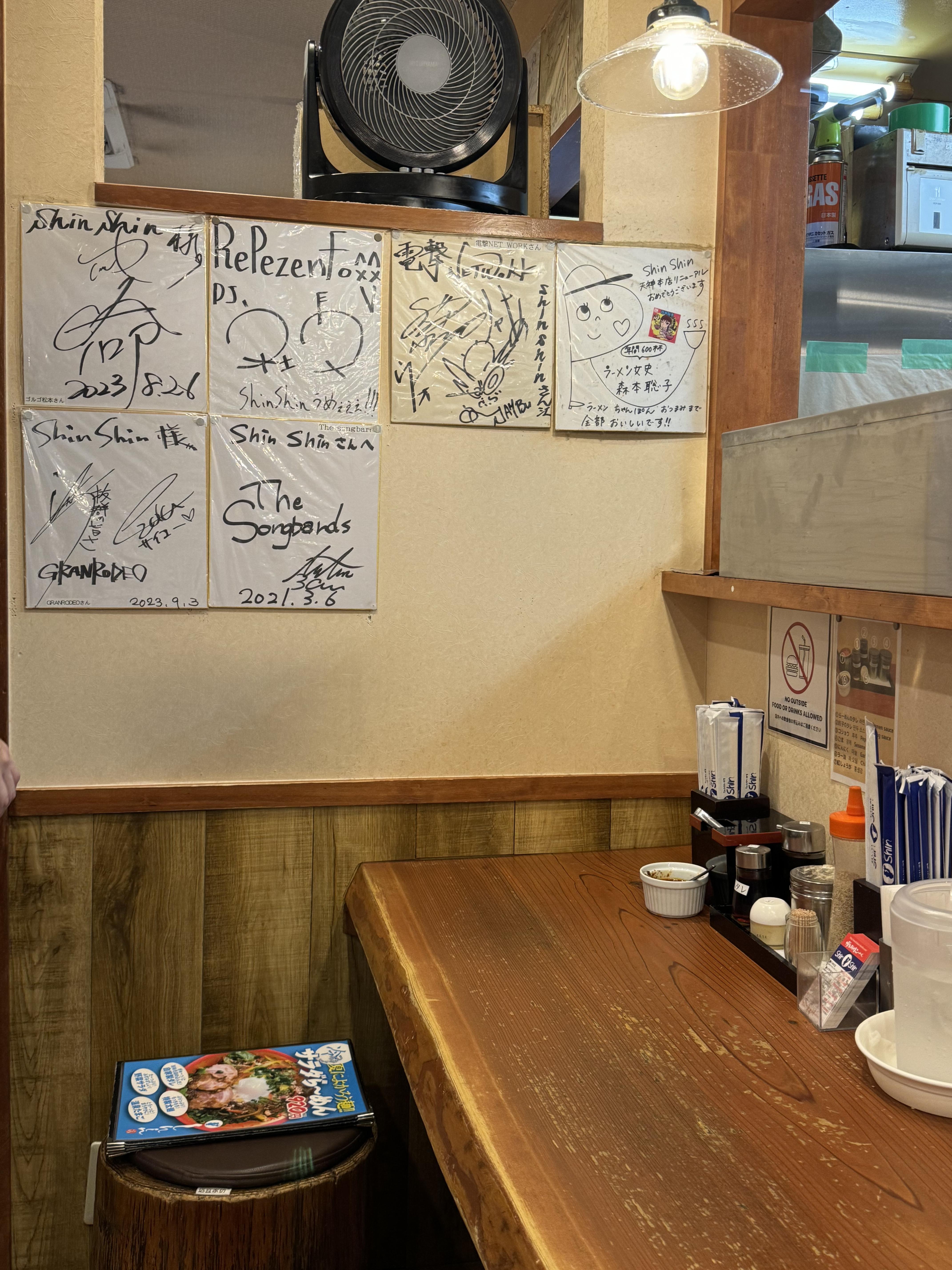 다행히 아침에 비해 오후에는 줄이 길지 않아서 20~30분 정도 기다렸고, 차례대로 입장했다. 후쿠오카 신신라멘 본점 매장은 아담하지만 온통 벽면에 사인으로 가득 차 있었다.